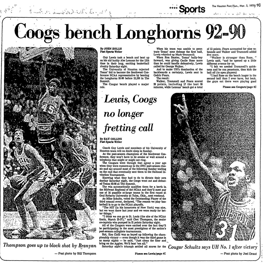 Guy V. Lewis used his bench in a major way in the game: George Walker, Mark Trammell, and Cedric Fears combined to score 29 points, including 17 in the second half, 16 rebounds, and 13 assists.